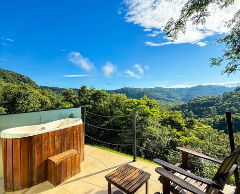 Na área externa está disponível um fire pit (fogo de chão) com grelha para um delicioso churrasco ou até mesmo assar marshmallows sob a luz das estrelas e um maravilhoso deck para curtir a vista para o vale com banheira com hidro aquecida e um balanço infinito.