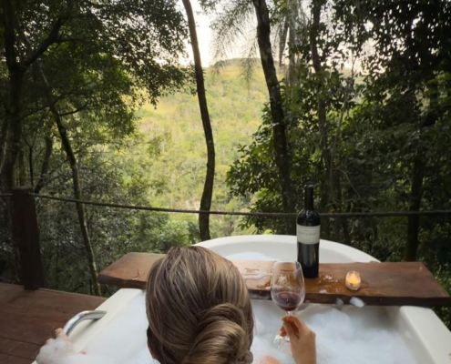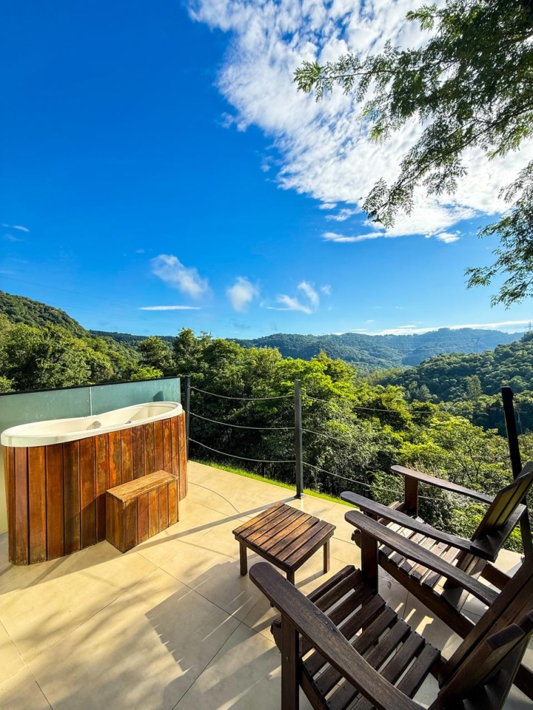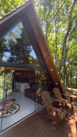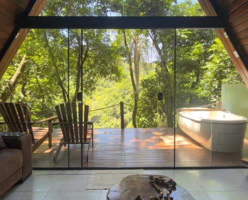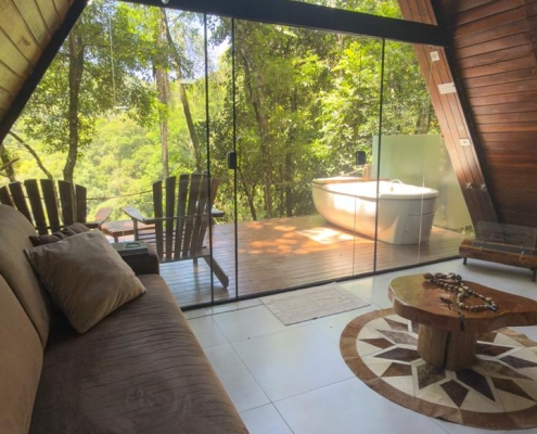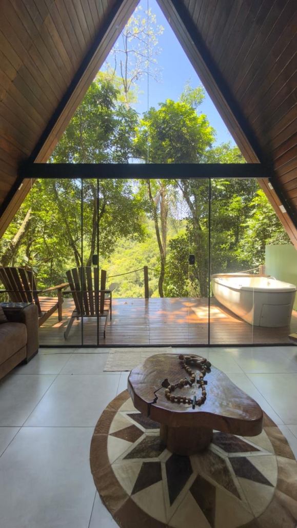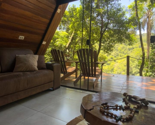 A Cabana da Mata em estilo A-Frame, foi criada e pensada para quem procura uma experiência única em meio a natureza, construída em um lugar estratégico, com vista para cascata, é perfeita para descansar e contemplar a natureza. O deck possui cadeiras confortáveis e banheira com hidromassagem e aquecimento.