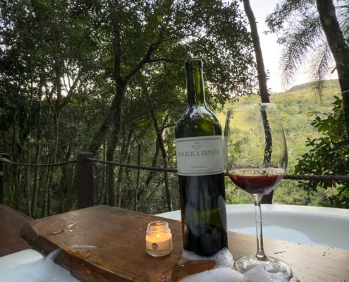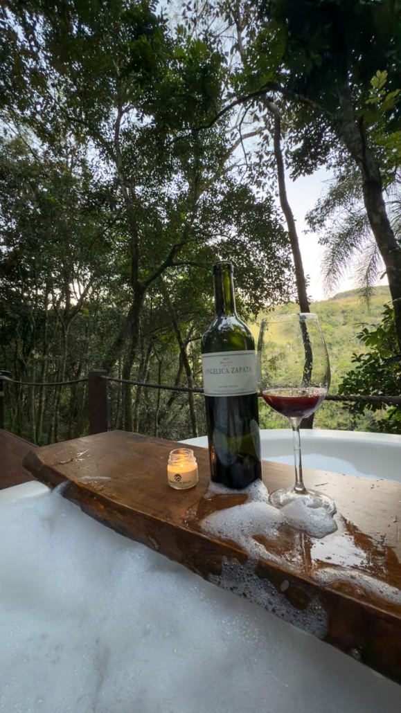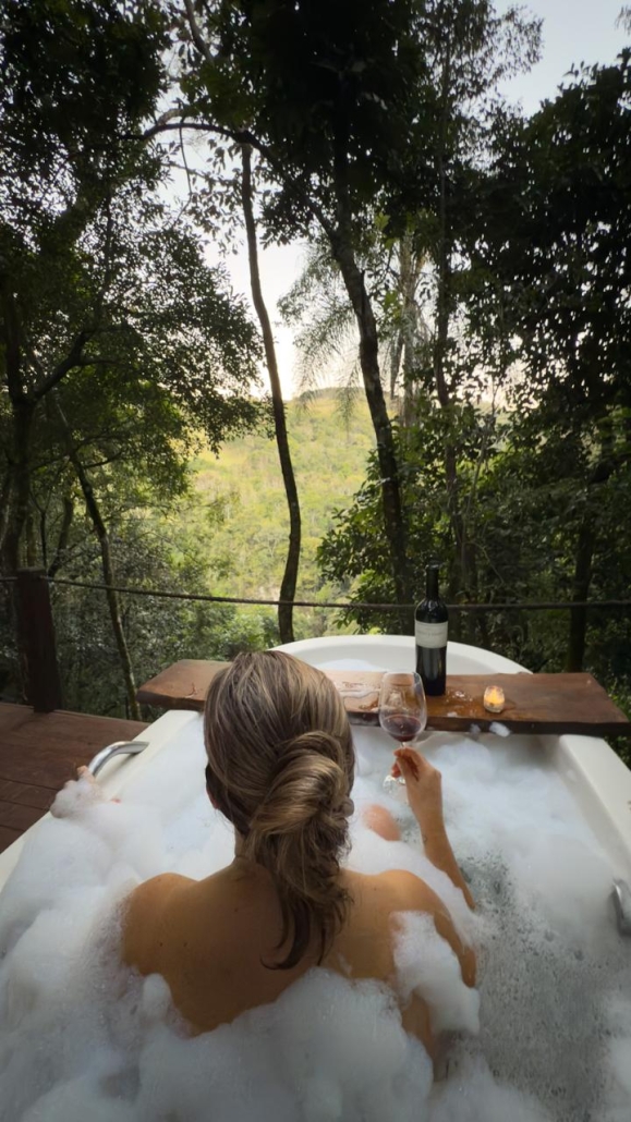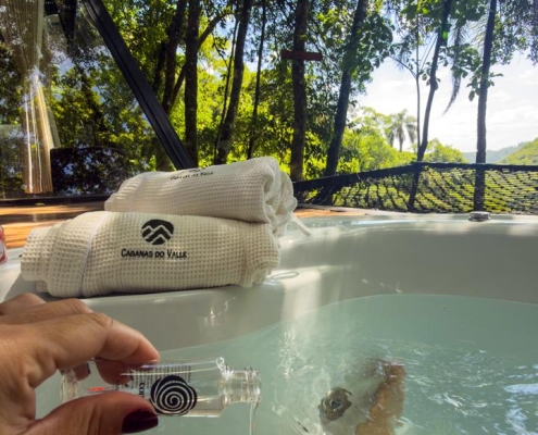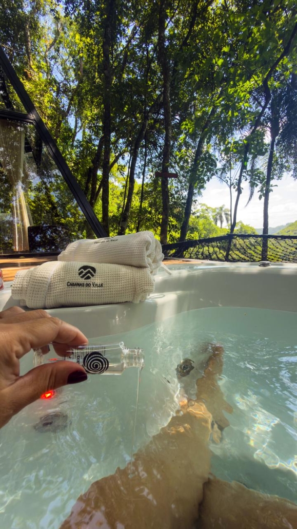 Mas, pensamos em tudo, a pirâmide conta ainda com um banheiro com uma vista incrível para a mata, já que uma das paredes é totalmente de vidro, deck com uma jacuzzi com aquecimento e uma rede suspensa para o vale.